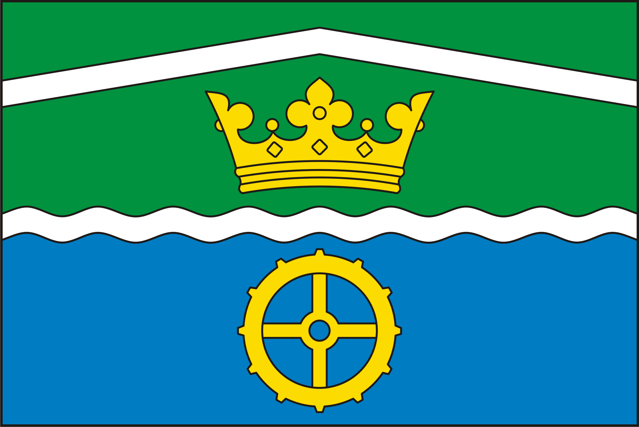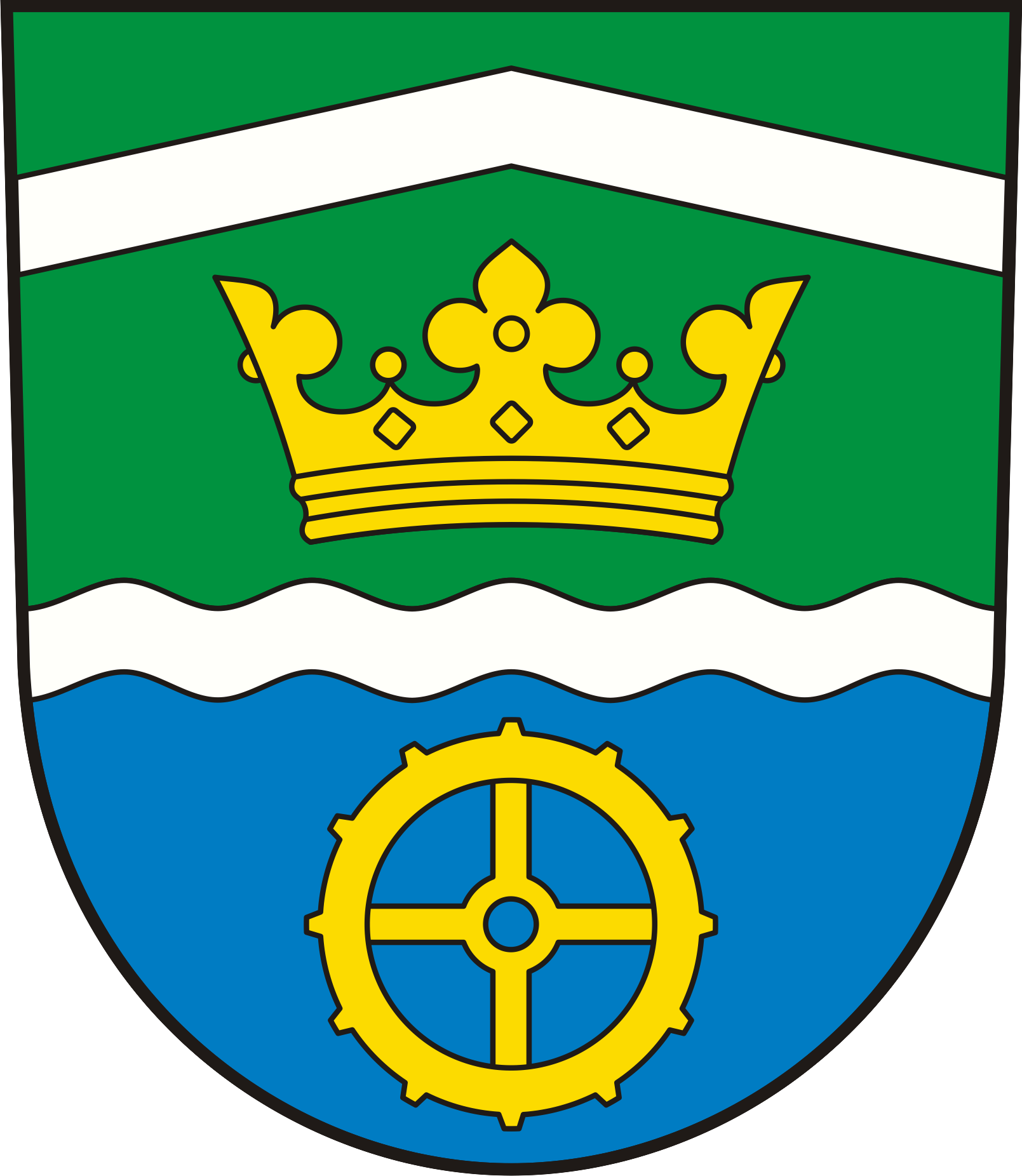 Vlnitá pata štítu odkazuje k Huťskému rybníku v Neradově.