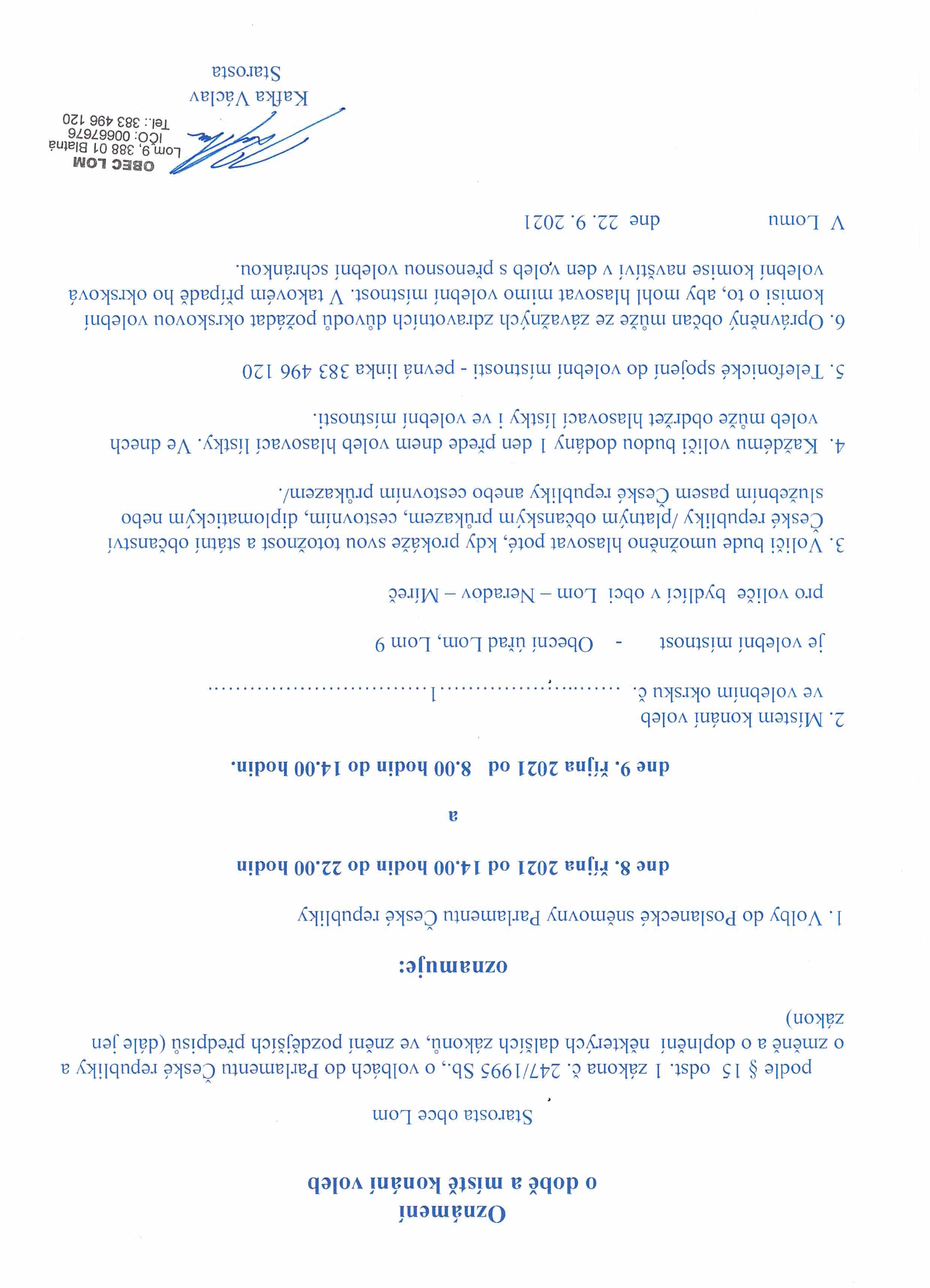 Oznámení o době a místě konání voleb